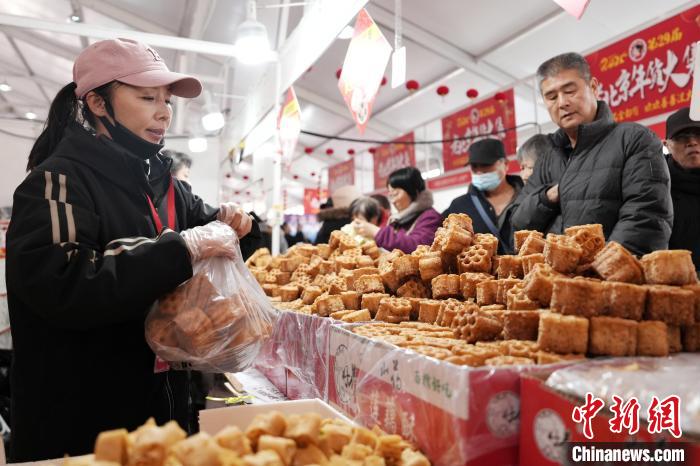 1月3日,第29屆老北京年貨大集在位于北京的全國農(nóng)業(yè)展覽館開市。圖為民眾在大集上采買蓮藕酥。中新社記者 張祥毅 攝