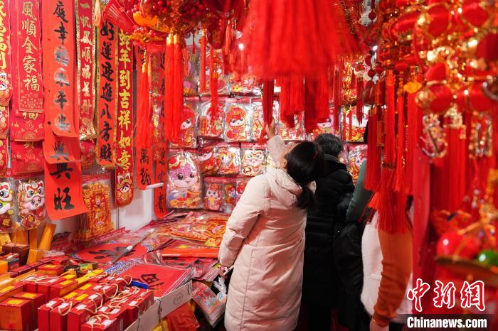 1月3日,第29屆老北京年貨大集在位于北京的全國農(nóng)業(yè)展覽館開市。圖為民眾在大集上采買年符。中新社記者 張祥毅 攝