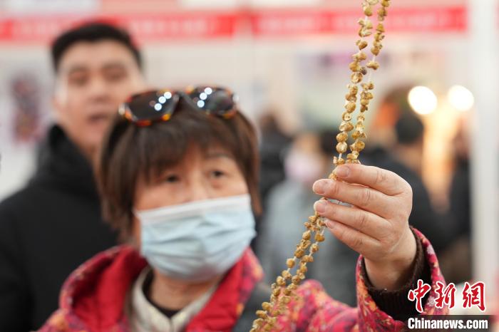 1月3日,第29屆老北京年貨大集在位于北京的全國農(nóng)業(yè)展覽館開市。圖為市民在大集上采買香菇干。中新社記者 張祥毅 攝