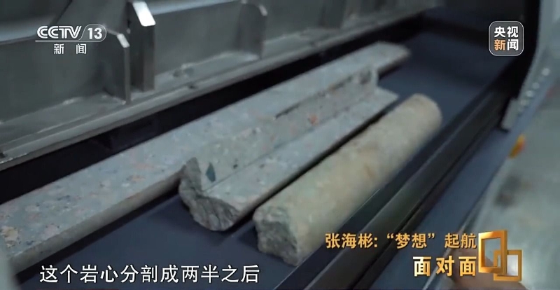 張海彬:切割完差不多就是1.5米的長(zhǎng)度,這個(gè)巖心分剖成兩半之后,其中一半是運(yùn)到船的巖心庫(kù),另外一半就會(huì)運(yùn)到外面的這個(gè)基礎(chǔ)地質(zhì)研究室進(jìn)行分析。