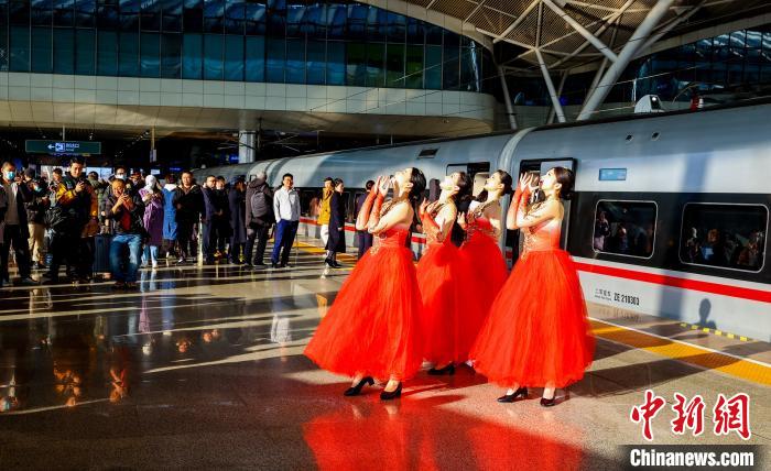圖為工作人員在武漢站站臺(tái)上表演節(jié)目。中新社記者 張暢 攝