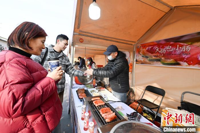 1月9日,市民品嘗臺灣烤腸。中新社記者 王剛 攝