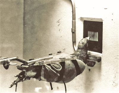 仔細(xì)看上面這張圖,一只鴿子被人用皮筋輕輕地捆綁在支架上,僅有頭部可以自由轉(zhuǎn)動(dòng)。鴿子的嘴上套著一個(gè)特殊的裝置,通過(guò)有規(guī)律的啄擊面前黑色屏幕上的圖案,似乎正在進(jìn)行某項(xiàng)實(shí)驗(yàn)。這究竟是怎么回事呢?