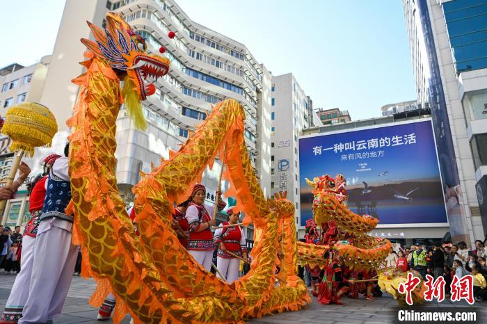 1月23日,舞龍隊(duì)伍在昆明南屏步行街巡游賀新春。中新社記者 李嘉嫻 攝