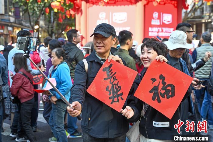 1月25日,廣東廣州,已有百年歷史的西湖花市開市迎客。圖為西湖花市開市巡游活動中的英歌舞表演吸引市民。中新社記者 陳驥旻 攝