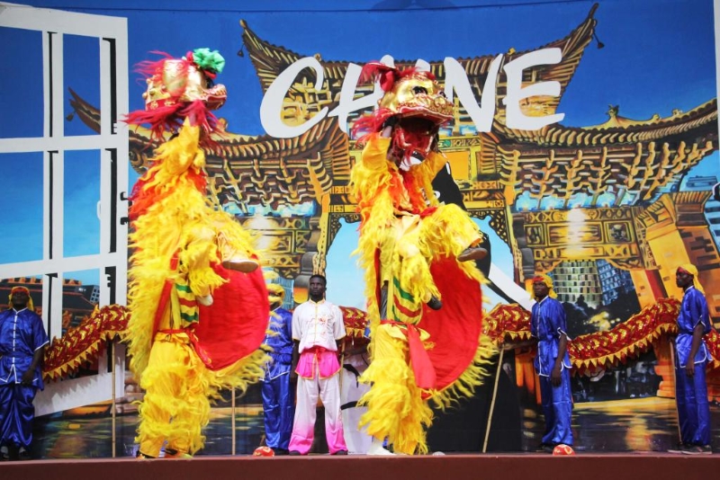 1月25日,在貝寧科托努的貝寧中國文化中心,演員在春節(jié)聯(lián)歡晚會(huì)上表演舞獅。新華社發(fā)(塞拉芬攝)
