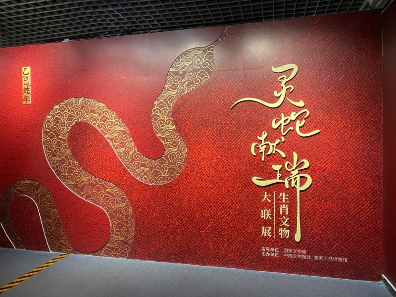 “靈蛇獻(xiàn)瑞——2025乙巳蛇年生肖文物大聯(lián)展”入口處的大幅海報(bào)。新華社記者 羅鑫 攝