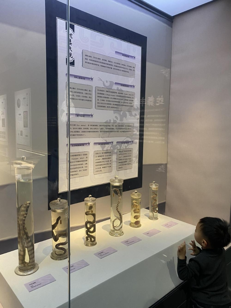 浸泡于玻璃瓶中的蛇、纏繞在“樹干”上的蛇、揚(yáng)首疾行的蛇,細(xì)密的蛇骨骼,盤曲的蛇藥材……近50件精挑細(xì)選的珍稀蛇類標(biāo)本類型豐富、姿態(tài)自然、做工精致,加深著人們對(duì)蛇類演化、結(jié)構(gòu)特征、行為習(xí)性、種類分布等知識(shí)的印象。