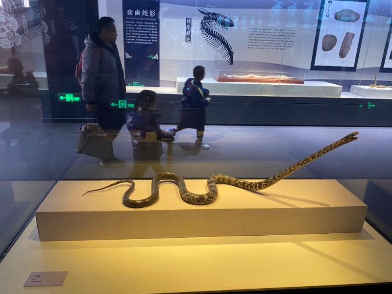 作為脊椎動(dòng)物的成員,起源自陸生蜥蜴的蛇類也在演繹著別樣的精彩。在緊鄰中央展廳的臨展廳,同步亮相的“靈蛇獻(xiàn)瑞——2025乙巳蛇年生肖文物大聯(lián)展”借著中國(guó)農(nóng)歷蛇年到來的契機(jī),吸引不少觀眾在觀“龍”后又來尋“蛇”。