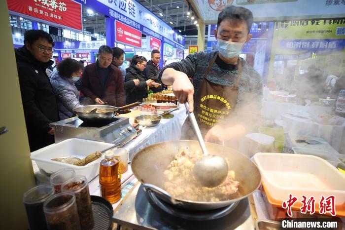 2月24日,江蘇南京,工作人員在食材展臺烹飪美食。 中新社記者 泱波 攝
