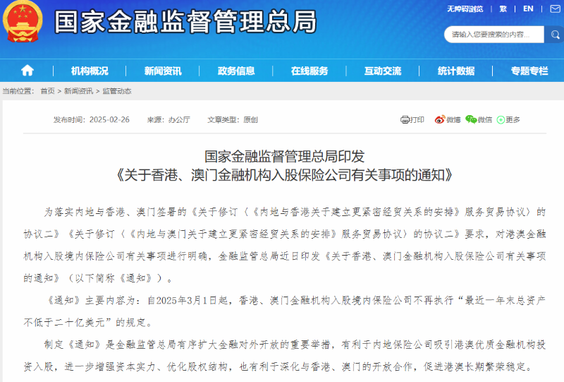 香港中通社2月26日電 據(jù)中國國家金融監(jiān)督管理總局網(wǎng)站26日消息,該局近日印發(fā)《關(guān)于香港、澳門金融機(jī)構(gòu)入股保險(xiǎn)公司有關(guān)事項(xiàng)的通知》,其主要內(nèi)容為:自3月1日起,香港、澳門金融機(jī)構(gòu)入股境內(nèi)保險(xiǎn)公司不再執(zhí)行“最近一年末總資產(chǎn)不低于二十億美元”的規(guī)定。