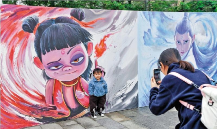圖:以《哪咤之魔童鬧?!窞橹黝}的涂鴉墻亮相海南省??谑薪诸^,吸引民眾前來拍照打卡。\中新社