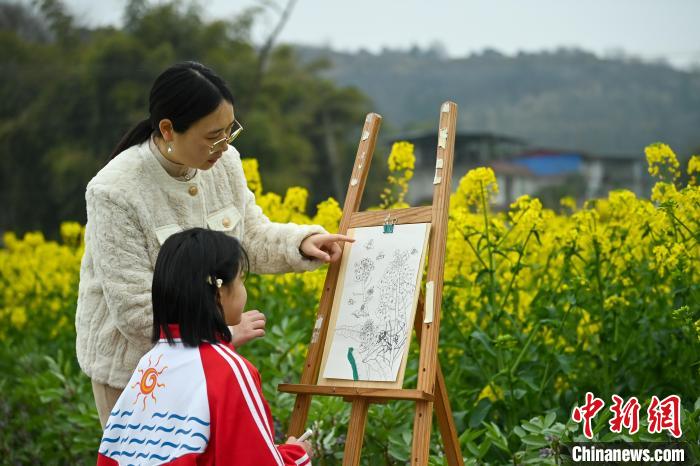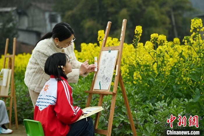 3月10日,四川眉山,美術老師廖方蘭油菜花田間指導學生們寫生創(chuàng)作。當日,天府新區(qū)眉山片區(qū)貴平鎮(zhèn)觀寺學校美術社團20余名師生走進鄉(xiāng)村田間開展寫生創(chuàng)作,通過賞花、探花、畫花、識花系列活動,讓學生們了解油菜花生長習性,同時感受春天氣息。中新社記者 劉忠俊 攝