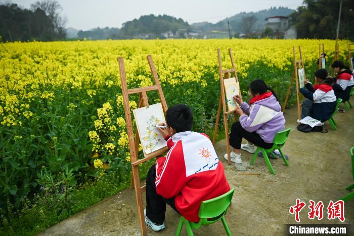 3月10日,四川眉山,油菜花田間學生們正在寫生創(chuàng)作。中新社記者 劉忠俊 攝