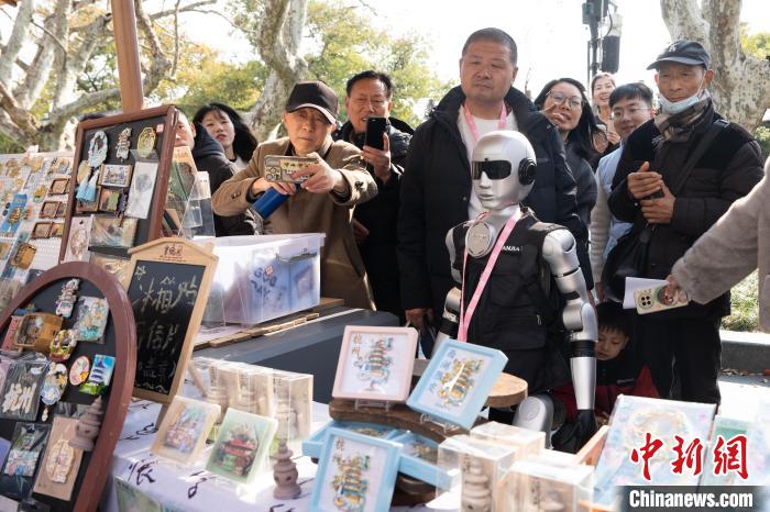3月16日,人形機(jī)器人“小楊”在西湖畔的市集嘗試攤位銷售崗位。當(dāng)日,杭州西湖邊的“湖畔有藝市”市集“上崗”了一位人形機(jī)器人實(shí)習(xí)生,吸引眾多游人駐足。中新社記者 吳君毅 攝