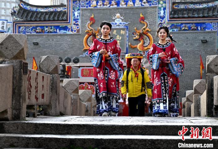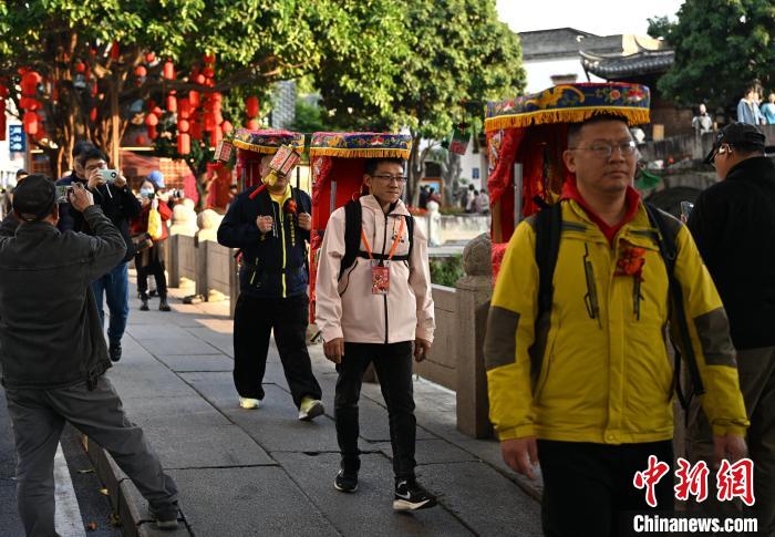 圖為兩岸青年代表經(jīng)過福州上下杭?xì)v史文化街區(qū)。中新社記者 呂明 攝
