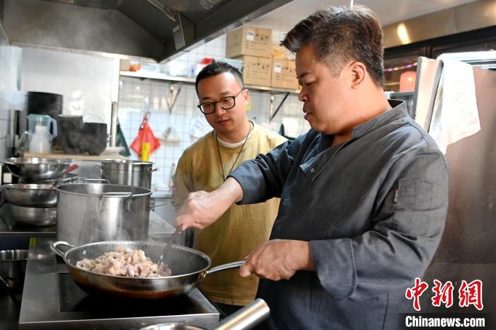 3月18日,臺胞黃品諺(右)在漳州古城“貴寶地”一邊翻炒五花肉,一邊向青年臺胞蔡鶴立(左)介紹鹵肉飯制作工藝。中新網(wǎng)記者 張金川 攝
