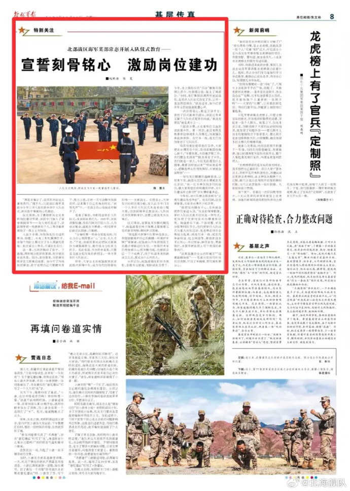 近日,91510部隊榮譽墻上的一幅相框突然火了,吸引官兵紛紛前來打卡,更成為大家熱議的話題。原來,不久前,一篇關于該部入隊儀式的新聞通訊刊發(fā)在《解放軍報》基層傳真版面頭條,這不僅是對這項儀式教育的認可,也是對該部按綱抓建、助力官兵成長的褒獎。(監(jiān)制:孫剛政 王悅 編審:趙陽 編輯:婁欣輝 郭景 作者:趙林浩 高淵 孫遜 余永博 陳昊)