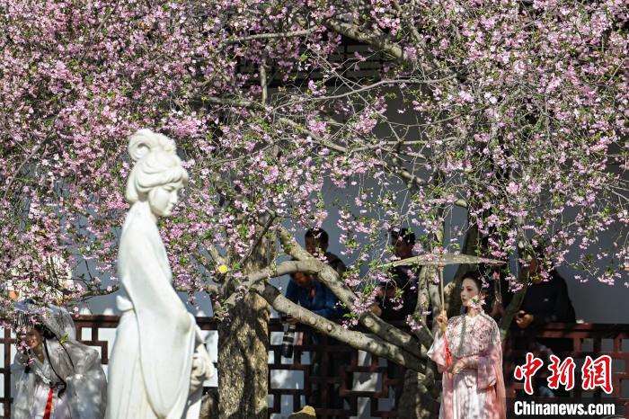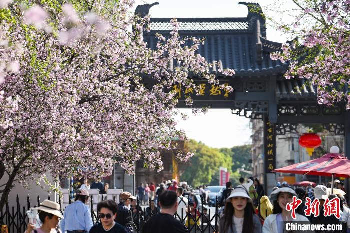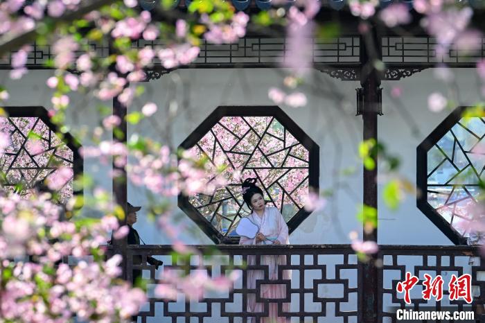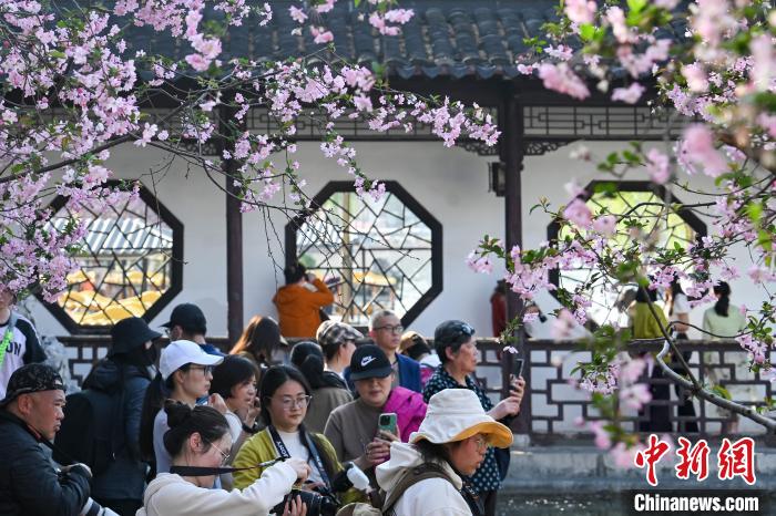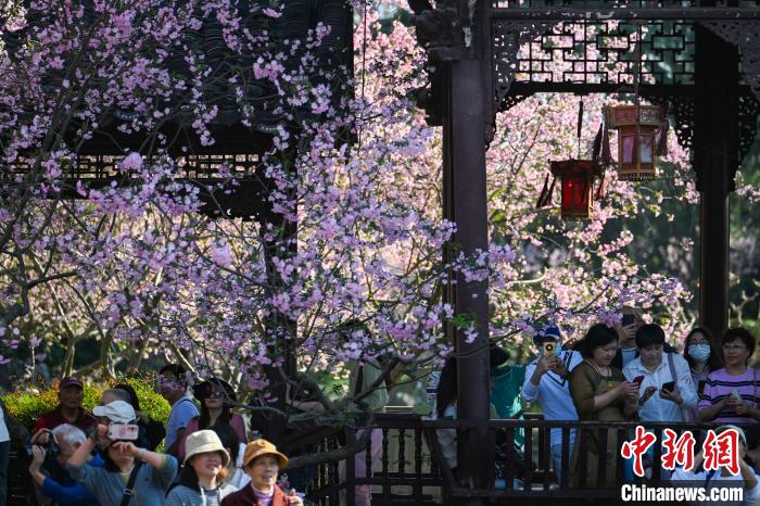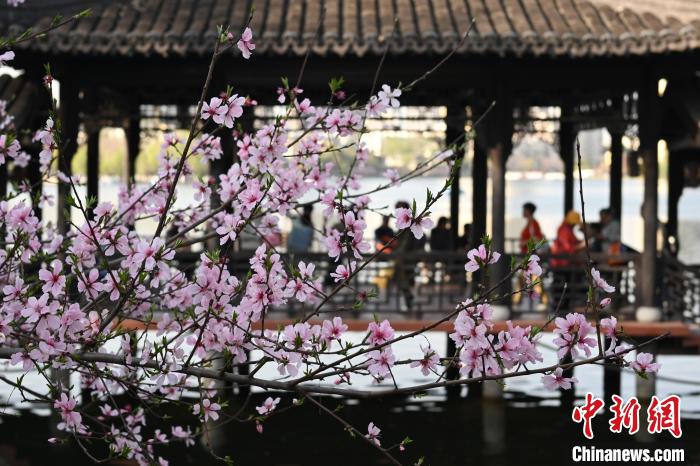 3月25日,江蘇南京,莫愁湖公園里海棠花盛開,與江南園林建筑相映成趣,吸引了眾多市民和游客前來,盡情享受春日美景。中新社記者 泱波 攝