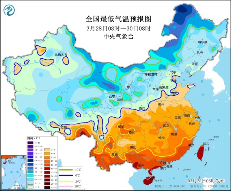 受寒潮影響,預(yù)計,3月28日08時至3月30日08時,新疆南疆盆地西部、西北地區(qū)東部、內(nèi)蒙古東北部、吉林東部、遼寧中南部、華北、黃淮、江淮、江漢、江南、華南大部以及四川東北部、重慶東北部、貴州東部等地將先后降溫8~10℃,其中,華北西部、黃淮、江淮、江漢、江南、華南北部、貴州東部等地部分地區(qū)降溫可達12~16℃,局地降溫超過18℃。過程最低氣溫將出現(xiàn)在3月29日夜間至30日凌晨,最低溫度0℃線將位于華北南部至秦嶺一帶。中央氣象臺3月28日06時繼續(xù)發(fā)布寒潮藍色預(yù)警。