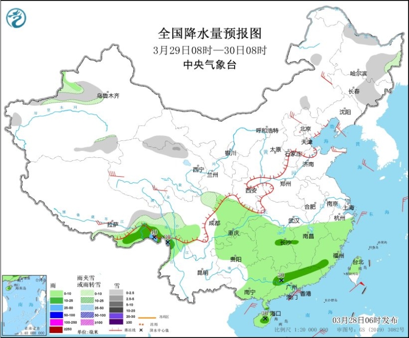 3月28日08時至29日08時,新疆伊犁河谷和南疆西部山區(qū)、內(nèi)蒙古東北部、黑龍江南部、吉林中東部、甘肅南部、山西北部、西藏東部、川西高原北部等地部分地區(qū)有小到中雪或雨夾雪,局地有大雪(5~7毫米)。西藏東南部、西南地區(qū)東部、江淮西部、江漢大部、江南、華南等地部分地區(qū)有小到中雨,其中,廣東西南部和中部、海南島北部等地部分地區(qū)有大雨(25~40毫米)。新疆南疆盆地、內(nèi)蒙古中東部、遼東半島、河北北部、山東半島、浙江北部等地部分地區(qū)有5~6級風(fēng),西藏北部部分地區(qū)有7~8級風(fēng)。黃海大部海域、東海大部海域、臺灣海峽、臺灣以東洋面、巴士海峽、南海北部海域、北部灣將有7~8級、陣風(fēng)9~10級的大風(fēng)。