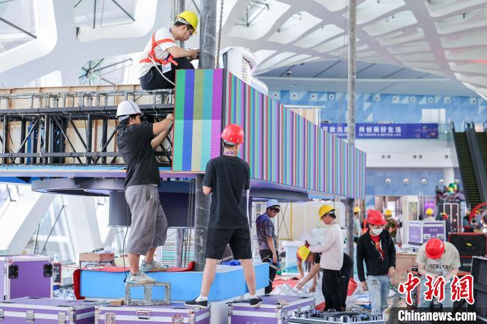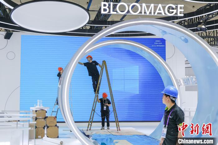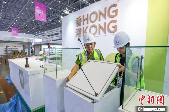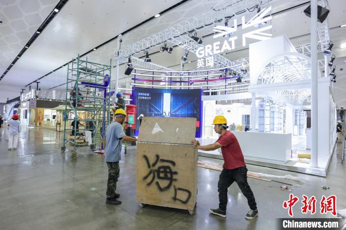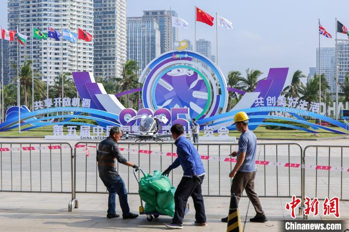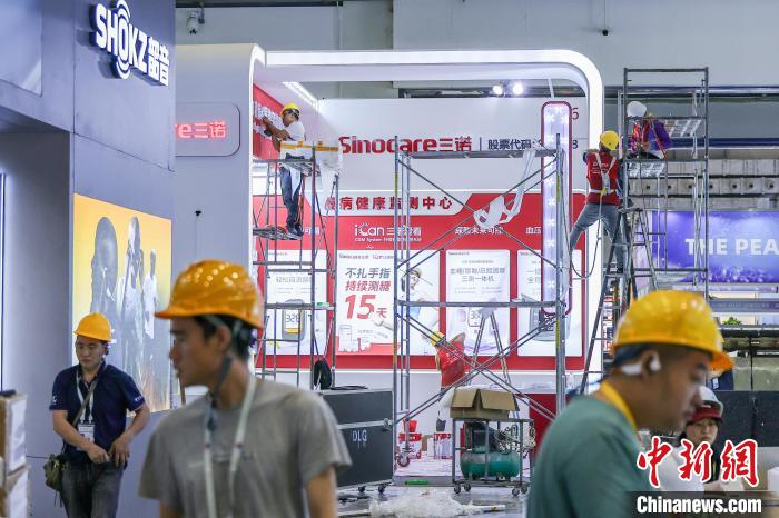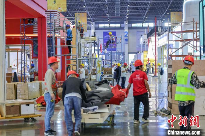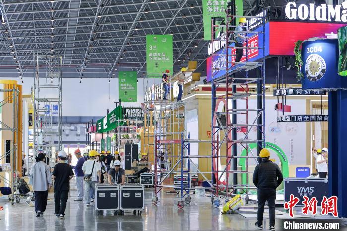 4月9日,第五屆中國國際消費(fèi)品博覽會(huì)主會(huì)場(chǎng)場(chǎng)館搭建工作進(jìn)入尾聲,目前各項(xiàng)工作正在有序推進(jìn)中。第五屆中國國際消費(fèi)品博覽會(huì)將于4月13日至18日在海南省舉辦,有71個(gè)國家和地區(qū)超過4100個(gè)品牌確認(rèn)參展。圖為工人正在加緊施工中。中新社記者 駱云飛 攝