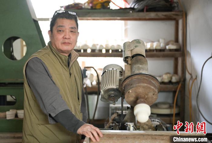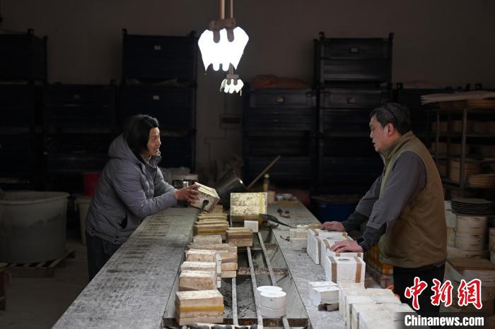 臺(tái)灣陶藝師徐瑞鴻二十余年前到大陸,十多年前他從景德鎮(zhèn)遷移到浙江衢州,重新開啟陶藝事業(yè)。如今,他在陶瓷創(chuàng)作和生產(chǎn)中引入當(dāng)代化、生活化等理念,從而讓優(yōu)秀的中國傳統(tǒng)陶瓷文化逐步回歸生活。圖為:徐瑞鴻(右)查看工作室自制的陶瓷模具。中新社記者 王剛 攝