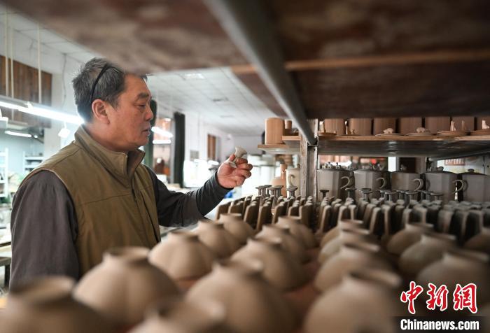 圖為:徐瑞鴻查看精致的酒盅陶坯。中新社記者 王剛 攝