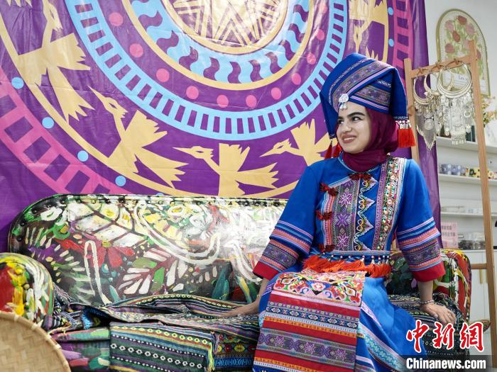 圖為外籍網(wǎng)紅穿著壯族服飾拍照。袁源彬 攝
