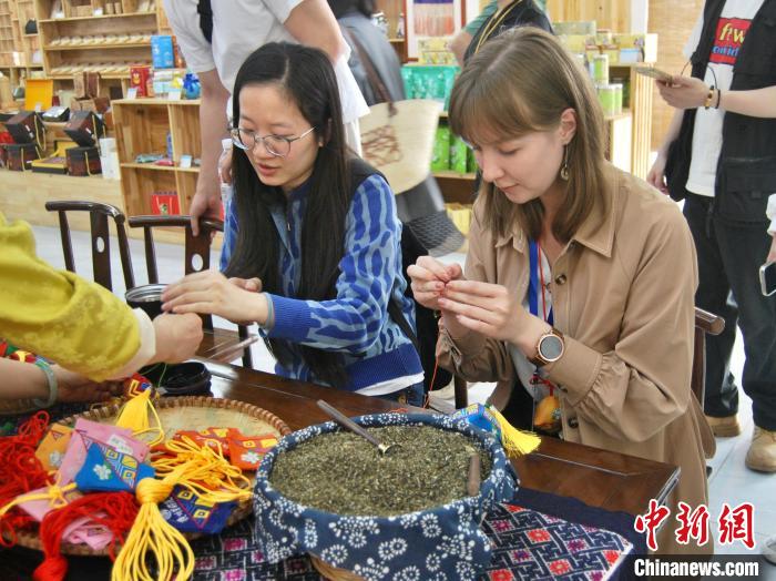 圖為境內(nèi)外媒體人在“中國(guó)茉莉花之鄉(xiāng)”橫州,體驗(yàn)制作帶有民族紋飾的茉莉花茶香囊。黃令妍 攝