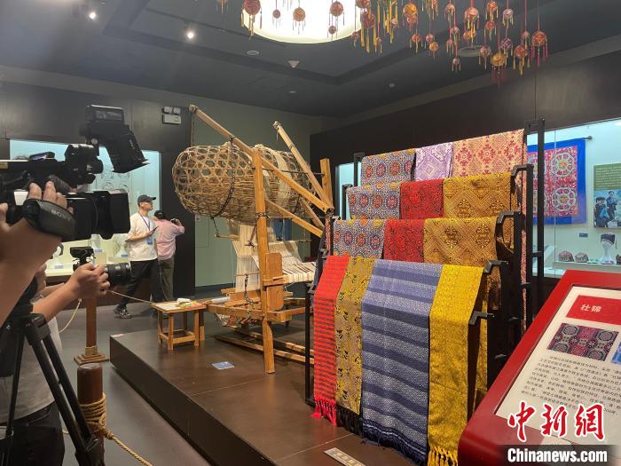 圖為廣西民族博物館內(nèi)展出的壯錦吸引境內(nèi)外媒體人。黃令妍 攝