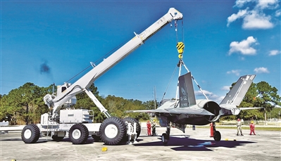 上圖中,一臺造型獨特的救援起重機(jī),輕松吊起一架空重超過14噸的F-35B戰(zhàn)斗機(jī),展現(xiàn)出“大力士”的實力。
