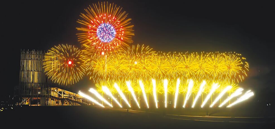 “融合”章節(jié)通過多種造型煙火同步綻放,象征新北成為文化交會場域;最終章“展望”以多層次金銀色瀑布煙火由高空傾瀉而下,象征著藝術的未來不斷推進,宣告新北市的嶄新美學時代正式啟動。