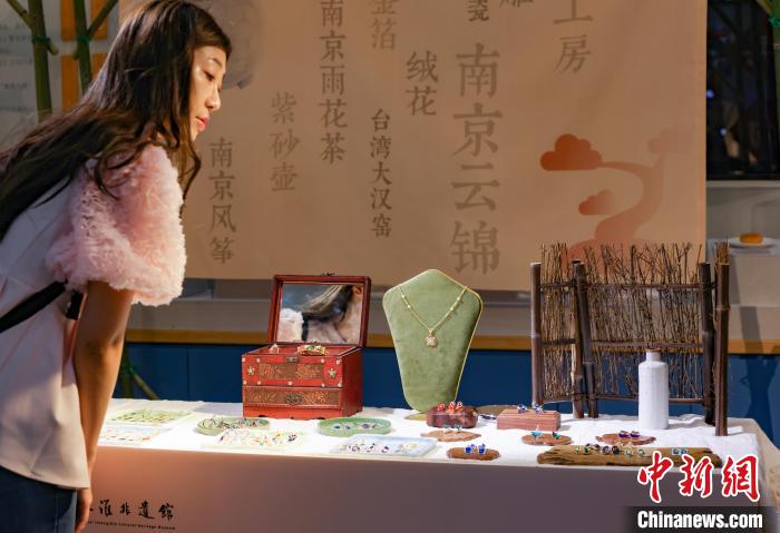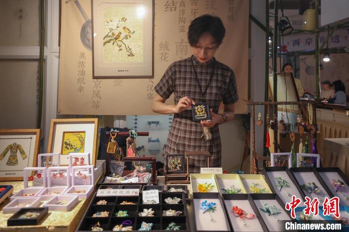 圖為南京云錦、絨花展臺(tái)上,工作人員將展品擺放整齊。中新社記者 泱波 攝