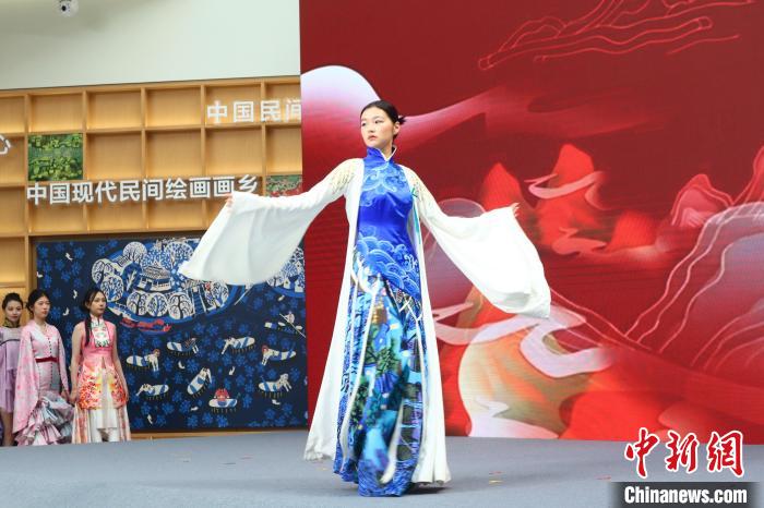 4月20日,模特身著以農(nóng)民畫元素為藍(lán)本設(shè)計(jì)的服飾亮相。中新社記者 黃彥君 攝