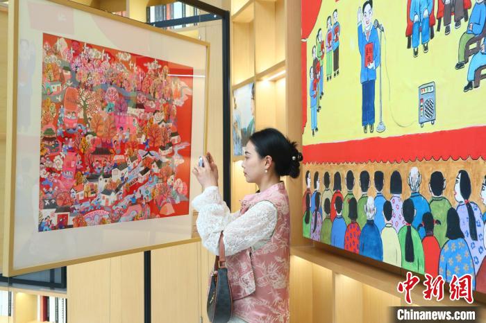 4月20日,農(nóng)民畫作品吸引參觀者。中新社記者 黃彥君 攝