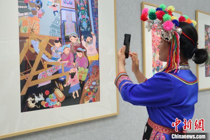 4月20日,一位苗族農(nóng)民畫創(chuàng)作者身著民族服飾,拍照記錄自己的參展作品。中新社記者 黃彥君 攝