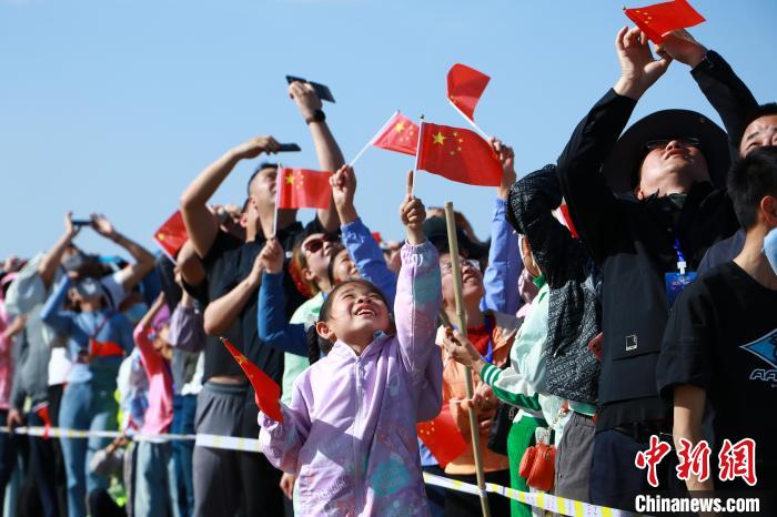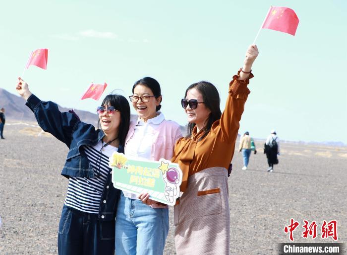 4月24日,航天愛好者手持國旗在觀禮點(diǎn)拍照留念。劉星 攝