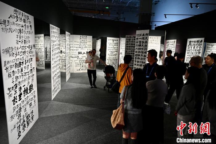 圖為由旋轉(zhuǎn)鏡面和書法作品組成的鏡字廳吸人眼球。中新社記者 王東明 攝