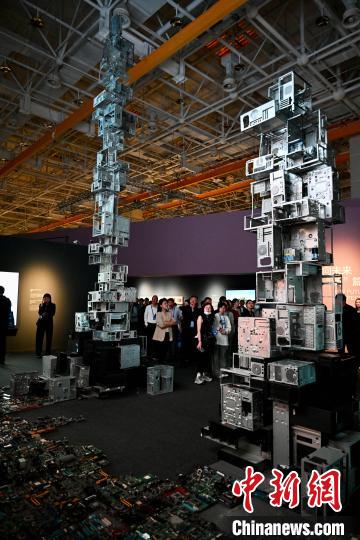 圖為市民觀看以電子廢棄物組裝的作品《圖恩格爾》。中新社記者 王東明 攝