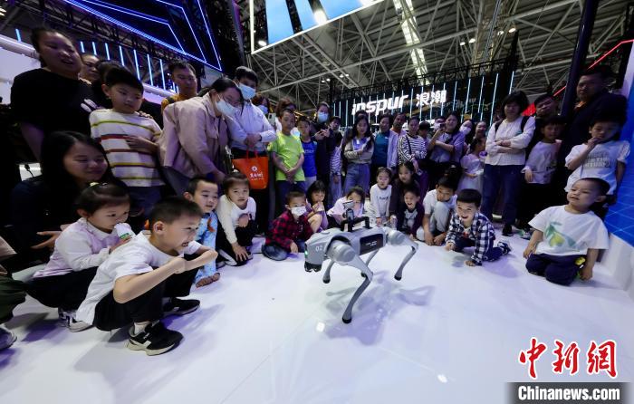 5月1日,福建福州,小朋友與智能機(jī)器狗親密接觸。中新社記者 王東明 攝