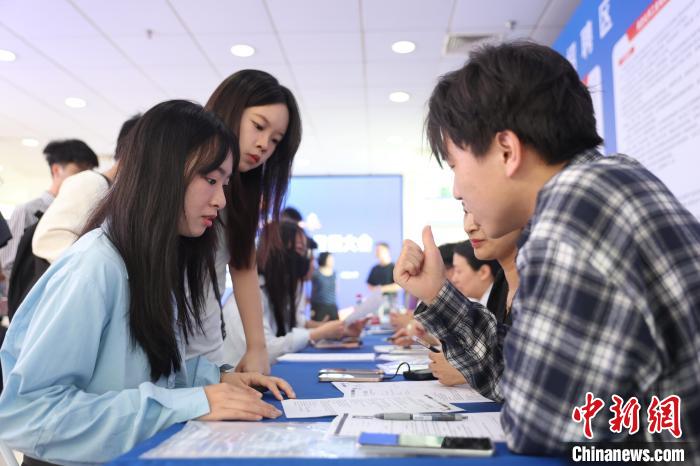 圖為南昌大學(xué)學(xué)生正在招聘會(huì)現(xiàn)場(chǎng)進(jìn)行咨詢。中新社記者 劉占昆 攝