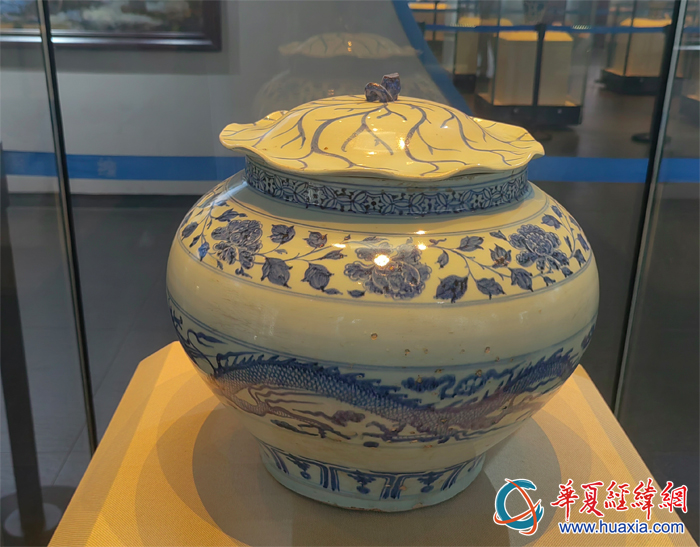 高安元青花博物館展示的青花云龍紋荷葉蓋罐。(攝影:虞鷹)