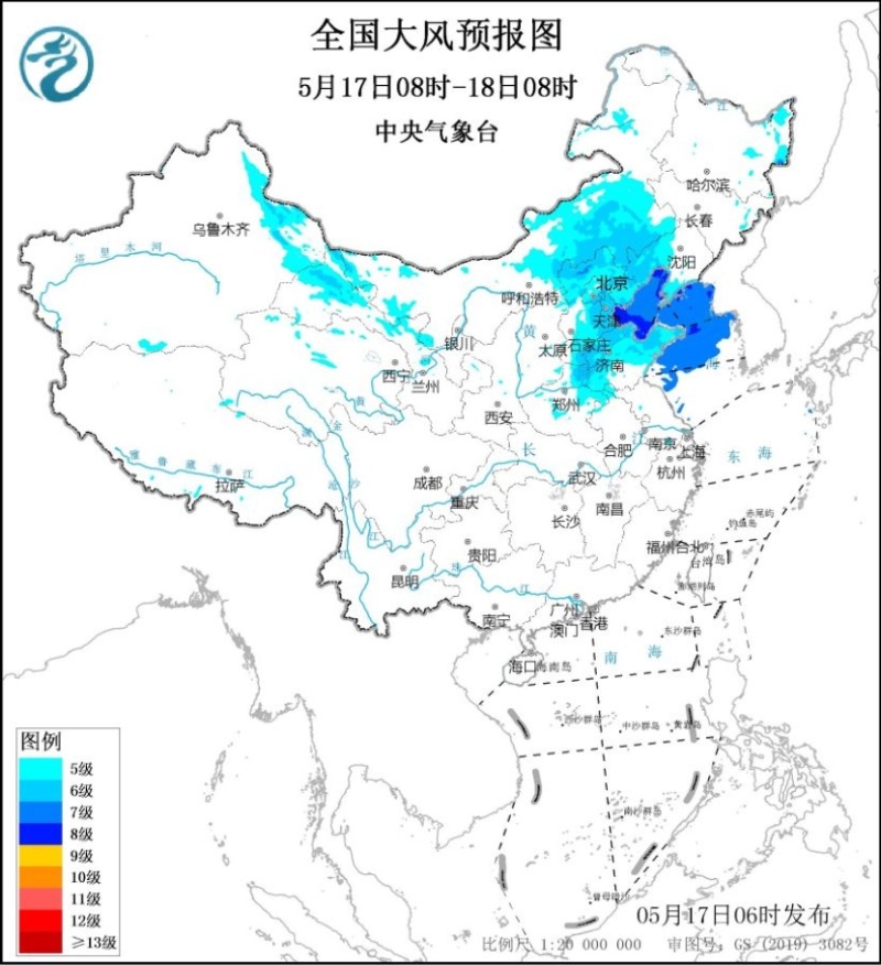 受氣旋和冷空氣影響,17日,西北地區(qū)東部、內(nèi)蒙古大部、華北地區(qū)、東北地區(qū)、黃淮北部等地有大風(fēng)天氣過(guò)程。中央氣象臺(tái)5月17日06時(shí)繼續(xù)發(fā)布大風(fēng)藍(lán)色預(yù)警。預(yù)計(jì),5月17日08時(shí)至18日08時(shí),內(nèi)蒙古中東部、河北大部、北京、天津、遼寧中西部、山東、河南北部、安徽北部、甘肅河西、新疆東部等地有5~6級(jí)風(fēng)、陣風(fēng)7~8級(jí),其中,河北北部、遼寧西部、天津東部等地局地有7~8級(jí)風(fēng)、陣風(fēng)9~10級(jí);渤海、渤海海峽、黃海北部和中部海域?qū)⒂?~8級(jí)風(fēng)、陣風(fēng)9~10級(jí)。