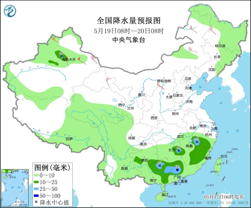 5月19日08時(shí)至20日08時(shí),新疆沿天山地區(qū)、江南中東部、西南地區(qū)東南部、華南北部等地部分地區(qū)有中到大雨,其中,廣東西北部等地部分地區(qū)有暴雨(50~60毫米)。內(nèi)蒙古河套地區(qū)和東部、黑龍江西南部、新疆北部、甘肅河西等地部分地區(qū)有4~6級(jí)風(fēng),其中,新疆東部山口地區(qū)有7~8級(jí)風(fēng)。
