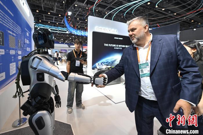 5月22日,“數(shù)智中東歐”展區(qū)內(nèi),參觀者和人形機(jī)器人握手,“數(shù)智中東歐”集中呈現(xiàn)了中東歐國(guó)家與中國(guó)在人工智能、機(jī)器人技術(shù)、通航科技等領(lǐng)域的前沿探索。當(dāng)日,第四屆中國(guó)—中東歐國(guó)家博覽會(huì)暨國(guó)際消費(fèi)品博覽會(huì)在浙江寧波啟幕。博覽會(huì)以“向新 向?qū)?向未來”為主題,設(shè)置“數(shù)智中東歐”“魅力中東歐”“精品中東歐”,以及出口消費(fèi)品展區(qū),展會(huì)總規(guī)模達(dá)8萬平方米,來自14個(gè)國(guó)家的8000余種特色商品亮相。中新社記者 王剛 攝