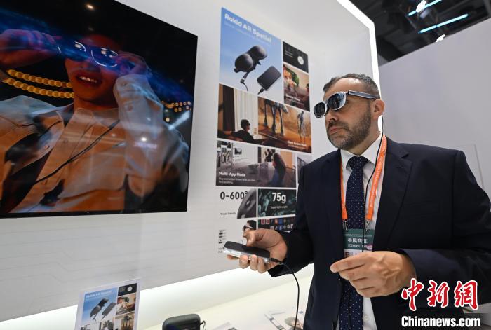 5月22日,“數(shù)智中東歐”展區(qū)內(nèi),參觀者體驗(yàn)智能眼鏡,“數(shù)智中東歐”集中呈現(xiàn)了中東歐國(guó)家與中國(guó)在人工智能、機(jī)器人技術(shù)、通航科技等領(lǐng)域的前沿探索。當(dāng)日,第四屆中國(guó)—中東歐國(guó)家博覽會(huì)暨國(guó)際消費(fèi)品博覽會(huì)在浙江寧波啟幕。博覽會(huì)以“向新 向?qū)?向未來”為主題,設(shè)置“數(shù)智中東歐”“魅力中東歐”“精品中東歐”,以及出口消費(fèi)品展區(qū),展會(huì)總規(guī)模達(dá)8萬平方米,來自14個(gè)國(guó)家的8000余種特色商品亮相。中新社記者 王剛 攝