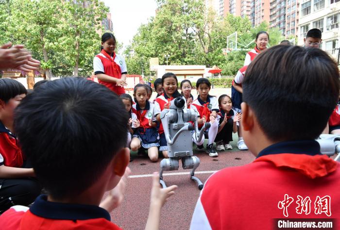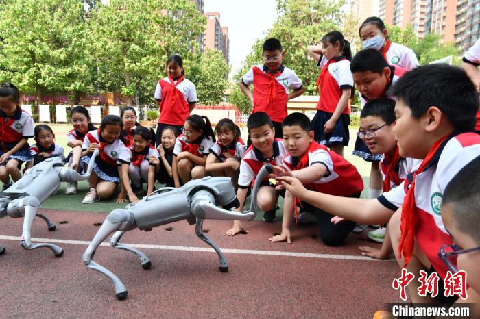 5月27日,河北省石家莊市育才小學(xué),學(xué)生與機(jī)器狗互動(dòng)。中新社記者 翟羽佳 攝