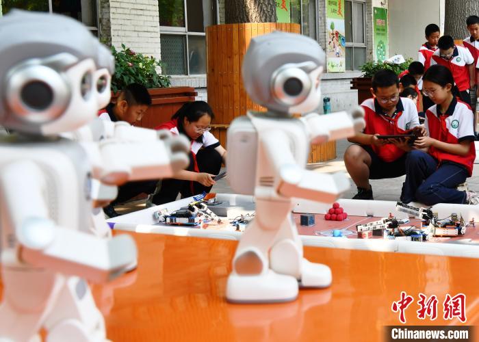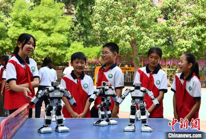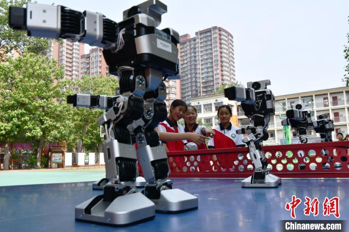 5月27日,河北省石家莊市育才小學(xué),學(xué)生被小型機(jī)器人“舞姿”吸引。5月24日至31日是第二十五個(gè)全國(guó)科技活動(dòng)周。該校開(kāi)展了豐富多彩的科技嘉年華活動(dòng),旨在搭建展示科技教育、感受科技魅力的平臺(tái),激發(fā)孩子創(chuàng)新創(chuàng)造活力。中新社記者 翟羽佳 攝