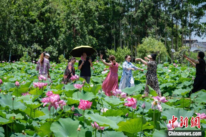 圖為游客在盛開的荷花邊跳舞。韓金雨 攝
